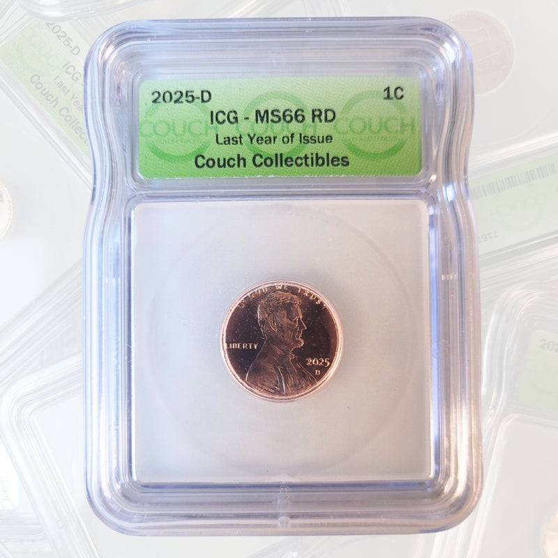 - (1) 2025-D Lincoln Penny Coin Last Year of Issue ICG MS66 RD Couch Collectibles